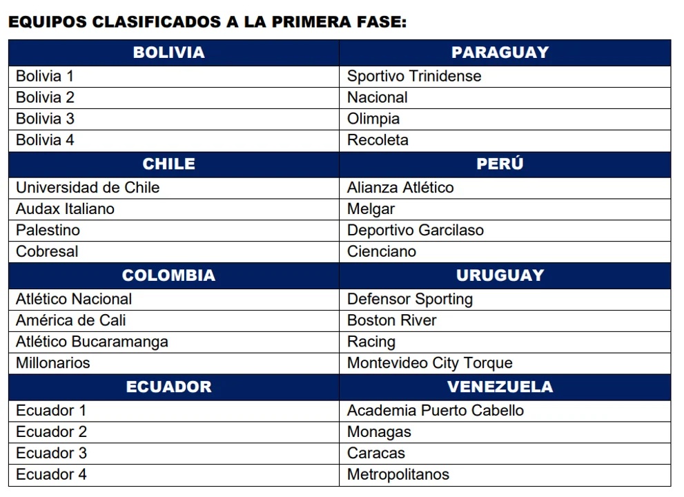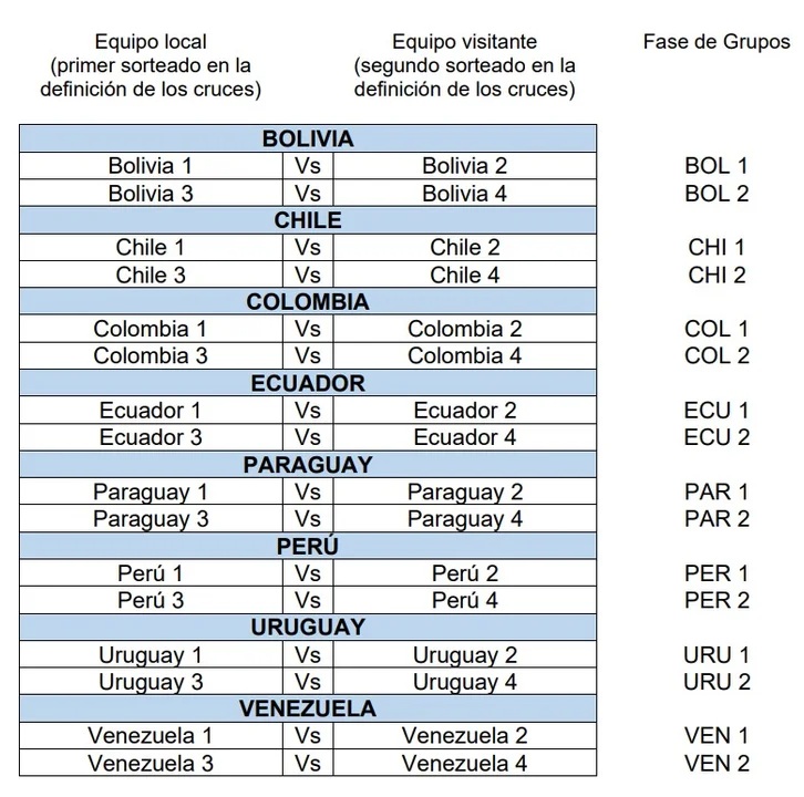 Los representantes de Bolivia, Chile, Colombia, Ecuador, Paraguay, Perú, Uruguay y Venezuela —cuatro por cada federación— serán ordenados en bolilleros nacionales para definir los emparejamientos. La localía también se resolverá por sorteo y corresponderá al primer club extraído en cada cruce.