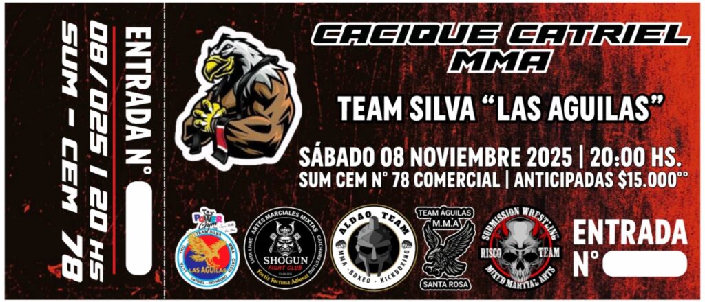 Catriel vivirá un espectáculo deportivo sin precedentes. El próximo 8 de noviembre, desde las 20 horas en el SUM del CEM 78, se realizará una velada de Artes Marciales Mixtas (MMA), organizada por la escuela “Las Águilas”, encabezada por el profesor Ezequiel Silva, reconocido referente del gimnasio del barrio Preiss.