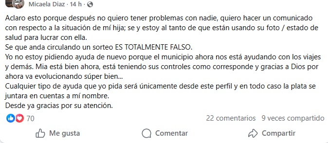 Según señalaron fuentes cercanas a la familia, no se autorizó ninguna campaña virtual ni se difundieron datos personales o cuentas bancarias para recibir donaciones. Por eso, pidieron a la comunidad verificar toda información antes de aportar dinero o compartir publicaciones.
