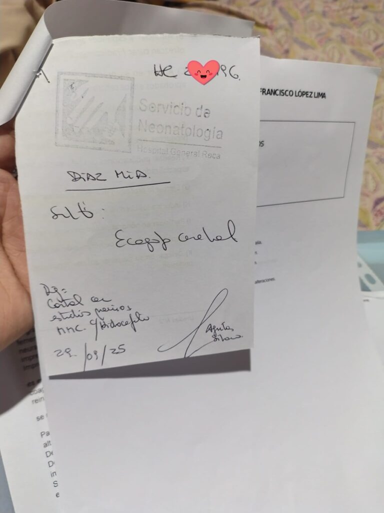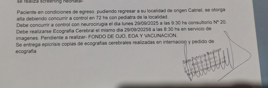 Si bien en el momento del alta no fue necesario colocar una válvula en la cabeza de la beba, ahora los controles son indispensables para determinar la evolución de la hidrocefalia. “Este lunes 29 debemos estar en Roca a las 8 de la mañana para estudios en su cabecita y el control de la neurocirujana”, explicó la madre.