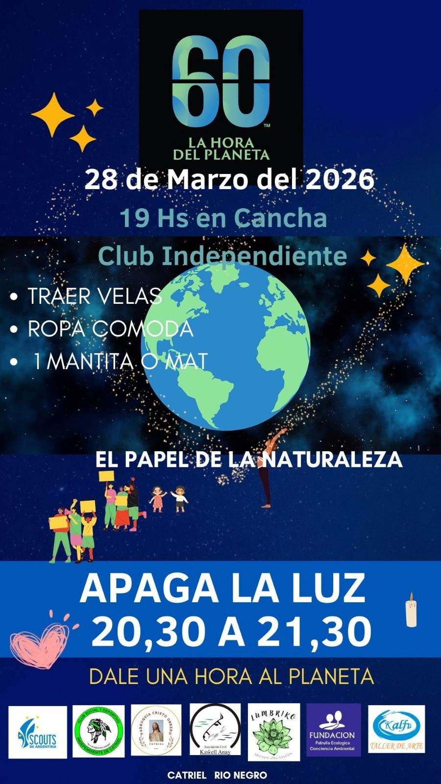 Catriel dirá nuevamente “presente” en una de las iniciativas ambientales más importantes a nivel global. Este sábado 28 de marzo, desde las 19, la comunidad se reunirá en la cancha del Club Independiente para participar de “La Hora del Planeta”, una propuesta que combina encuentro, reflexión y acción simbólica en defensa del ambiente.