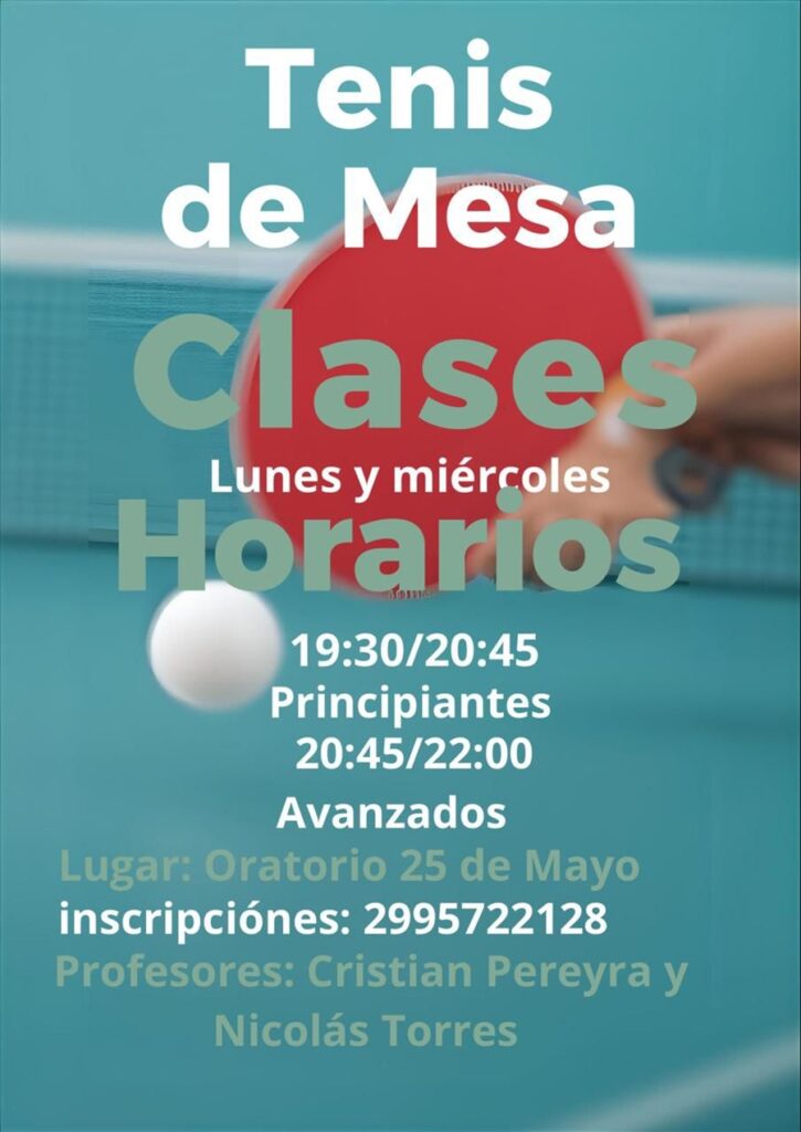 A partir del lunes 9 de marzo dará inicio la temporada 2026 de la Escuela de Tenis de Mesa de la ciudad de 25 de Mayo, La Pampa. Las actividades se desarrollarán en el Oratorio Don Bosco, ubicado sobre calle Santa Rosa, en inmediaciones de la Ruta Nacional 34, y estarán coordinadas por los profesores Nicolás Torres y Cristian Pereyra.