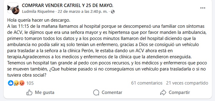 Según el relato difundido en redes sociales, el llamado al hospital se realizó a las 11:15 de la mañana, alertando sobre la descompensación de una mujer mayor, hipertensa y con signos compatibles con un ACV. “Primero tomaron todos los datos y a los pocos minutos llamaron del hospital diciendo que la ambulancia no podía salir porque solo tenían un enfermero”, señalaron. Finalmente, y “gracias a Dios”, lograron conseguir un auto para llevarla a la clínica Perón, donde fue atendida de inmediato.