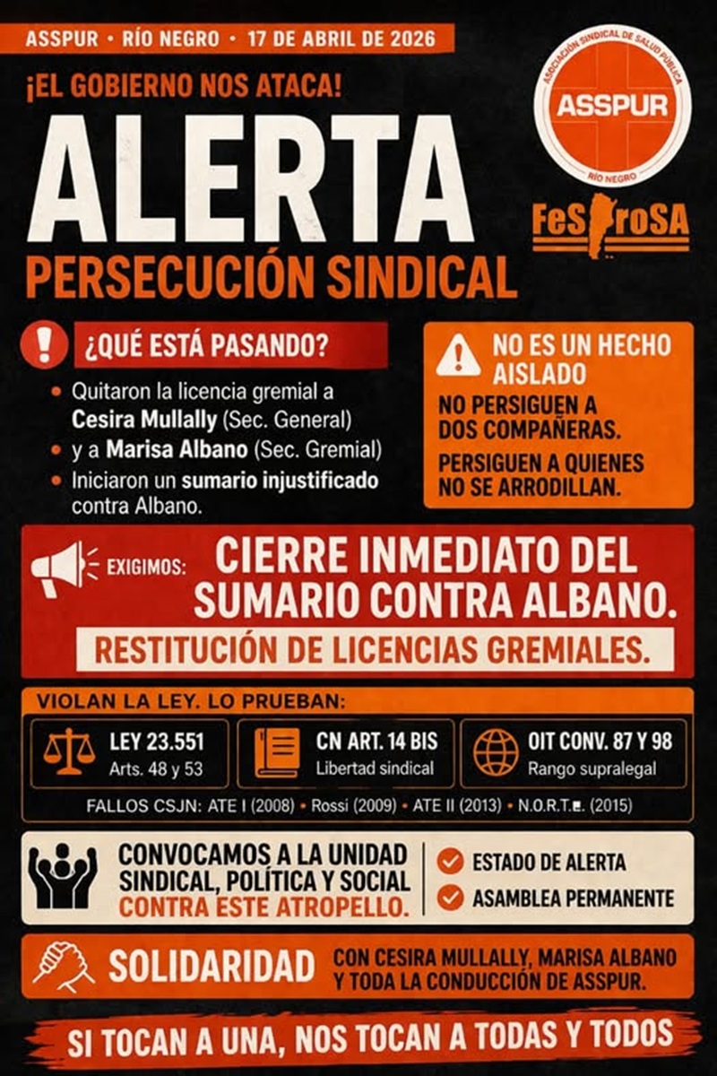 Lejos de un cierre, el conflicto parece abrir una nueva etapa. El sindicato convocó a organizaciones gremiales, espacios políticos y trabajadores de la salud a mantenerse en estado de alerta y asamblea permanente. “Solidaridad activa con Cesira Mullally, Marisa Albano y toda la conducción de ASSPUR. Si tocan a una, nos tocan a todas y todos”, afirmaron.