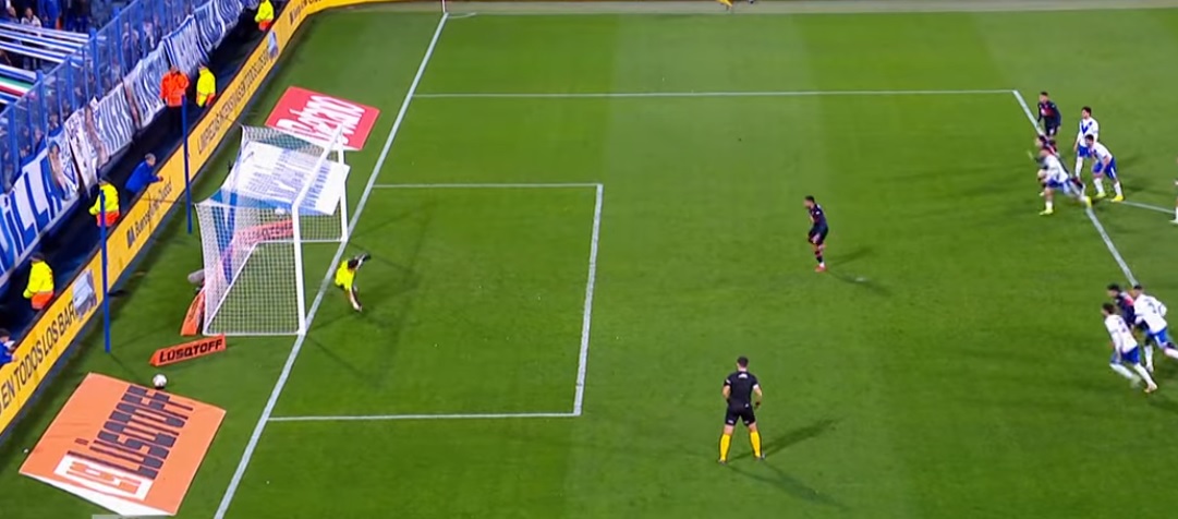 A los 40 minutos, la defensa de Vélez cometió un grave error defensivo y el arquero Tomás Marchiori impactó dentro del área contra Braian Martínez para evitar que pueda descontar en el cotejo y el juez principal sancionó penal. No obstante, a Diego Sosa no le tembló el pulso y marcó desde los doce pasos para mantener vivo el duelo.