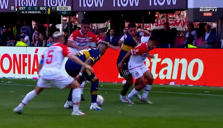 La primera parte del encuentro comenzó con pocas emociones y llegadas por parte de ambos equipos hasta que, a los 47 minutos, Exequiel Zeballos recibió una infracción dentro del área por parte de Facundo Rodríguez y el árbitro Leandro Rey Hilfer no dudó en sancionar la pena máxima.