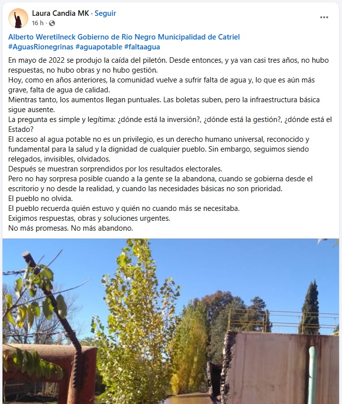 Este martes volvieron a multiplicarse los posteos de vecinos desesperados. “Cinco días sin agua en mi casa. Juntando plata para poner una cisterna. ¿Y el que no tiene para eso?”, escribió una usuaria, que además cuestionó la paradoja de ver correr agua en espacios verdes mientras los hogares están secos. Otro mensaje resume el hartazgo generalizado: “Catriel nunca va a crecer si no se soluciona definitivamente el tema del agua y la luz. Siempre lo mismo: cortes por ‘mejoras’, creciente y agua sucia. ¿Con qué van a salir a defender ahora?”. Son apenas dos ejemplos de una catarata de reclamos que ya derivó en una autoconvocatoria para una manifestación masiva.