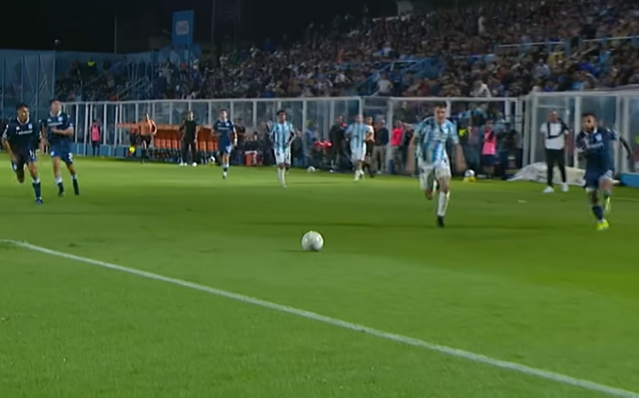 Racing abrió el partido a los 34 minutos, en su primera llegada del partido, con una subida del delantero Duván Vergara por izquierda, quien le ganó la posición al delantero Gianluca Ferrari, llegó hasta el fondo y definió alto al segundo palo, ante el achique del arquero Luis Ingolotti.